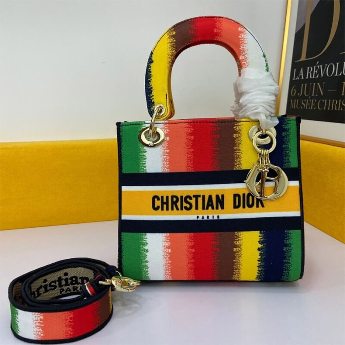 The Lady D-Lite handbag combines classic elegance with the modern feel of the brand. This style brings a new interpretation of the bayadere theme pattern this season. It is decorated with a full-scale multi-color mixed-color effect D-Stripes pattern embroidery, revealing a contemporary atmosphere, and the front is decorated with the “Christian Dior” logo. The thick gold-tone metal “D.I.O.R.” pendant is infused with pattern style. The medium-sized Lady D-Lite handbag has a wide, detachable double-sided embroidered shoulder strap, which can be carried, shouldered or slanted.