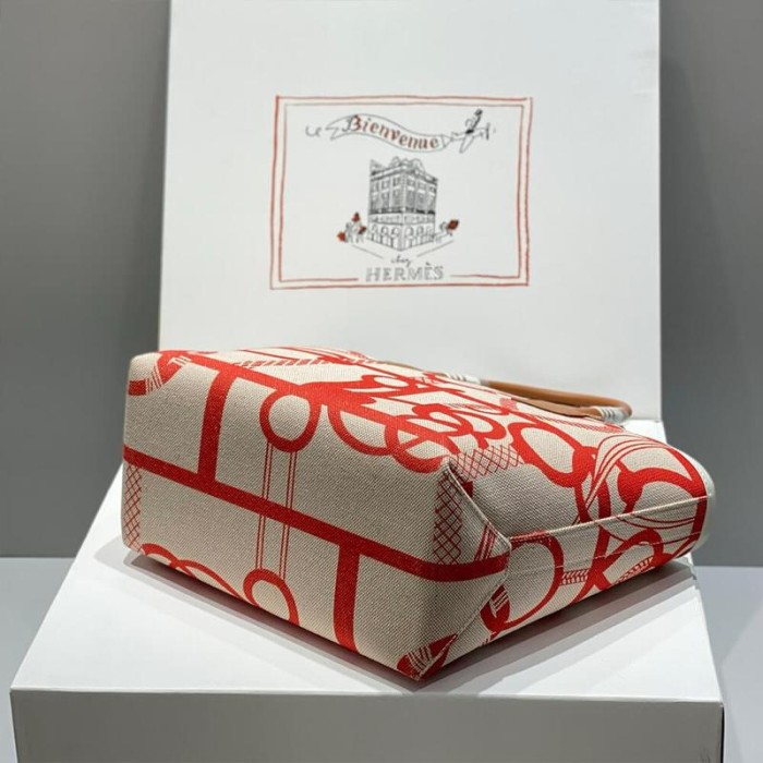 Bag in H canvas and Swift calfskin with removable bag bottom in canvas, large interior back pocket, D-ring, handles inspired by the rider’s crop and stirrup charm